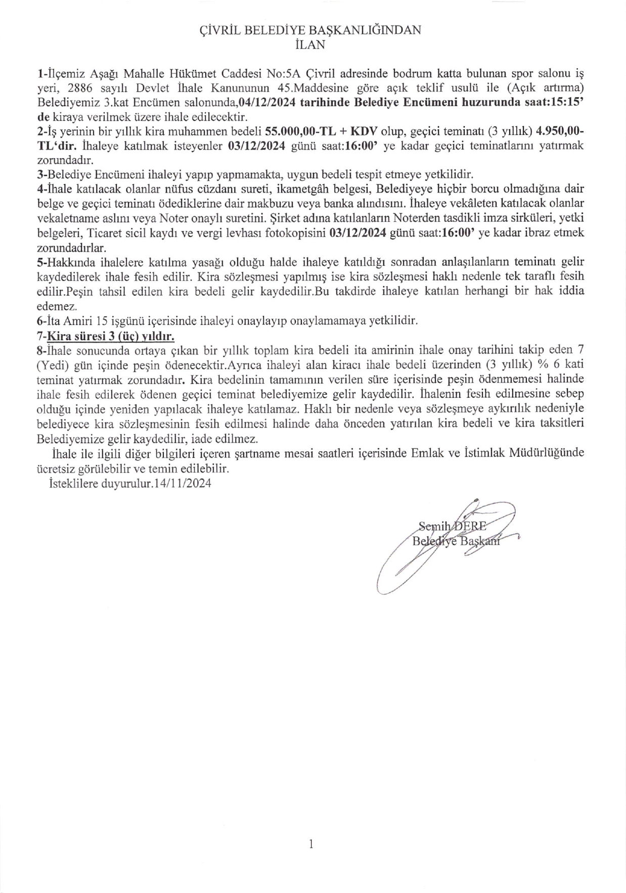 AŞAĞI MAH. HÜKÜMET CAD. NO:5A ADRESİNDE BULUNAN SPOR SALONU İŞ YERİ KİRA İHALESİ