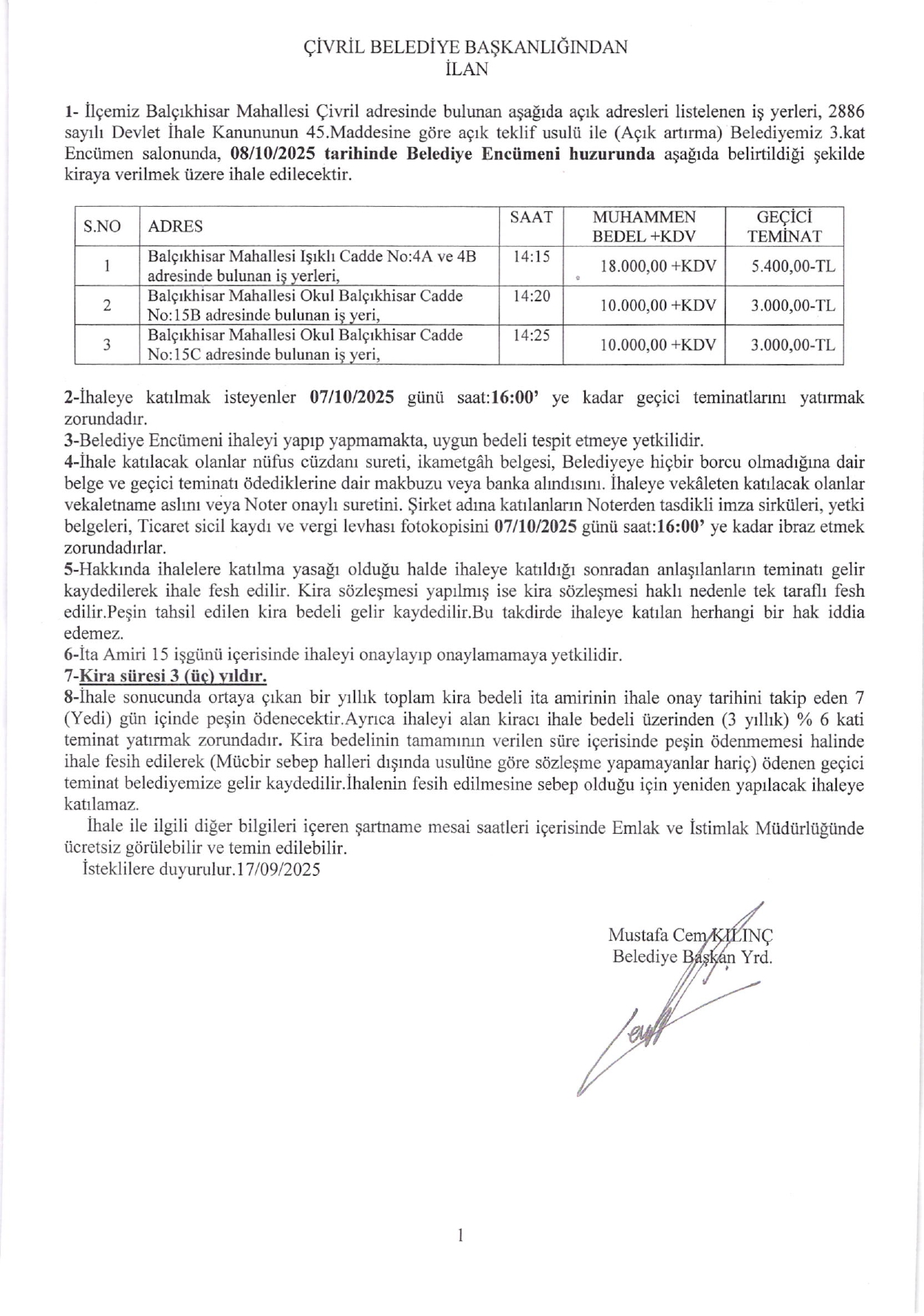 BALÇIKHİSAR MAH. ÜÇ ADET İŞ YERİ KİRA İHALESİ