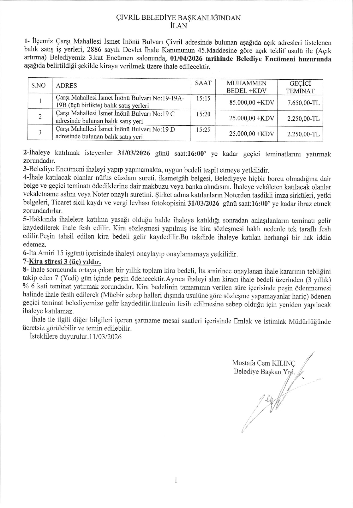 ÇARŞI MAH. İSMET İNÖNÜ BULVARI NO:19-19A-19B-19C VE 19D BALIK SATIŞ YERLERİ KİRA İHALESİ