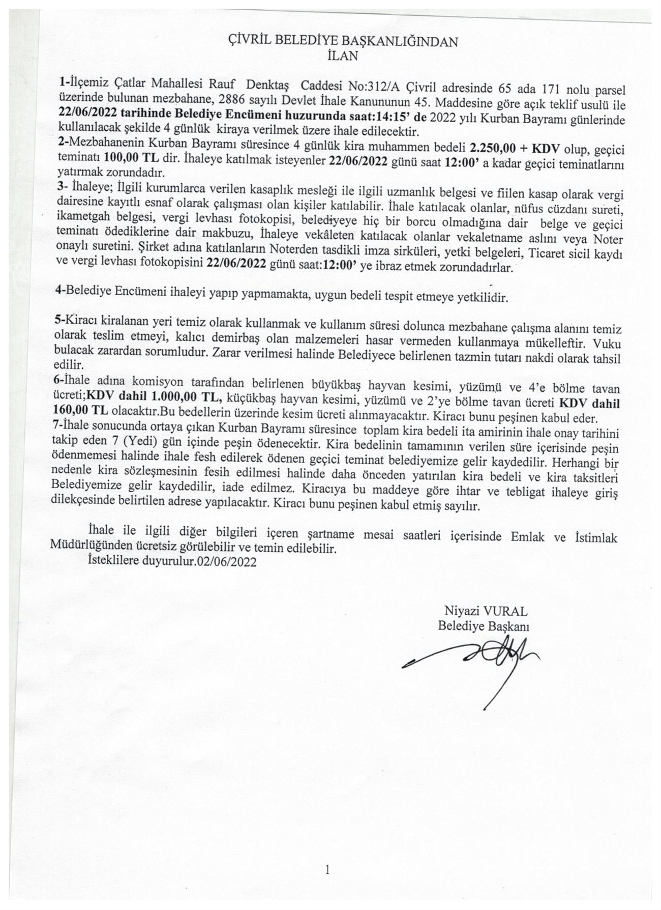 ÇATLAR MAH. RAUF DENKTAŞ CAD. NO:312/A MEZBAHANE 4 GÜNLÜK KİRA İHALESİ