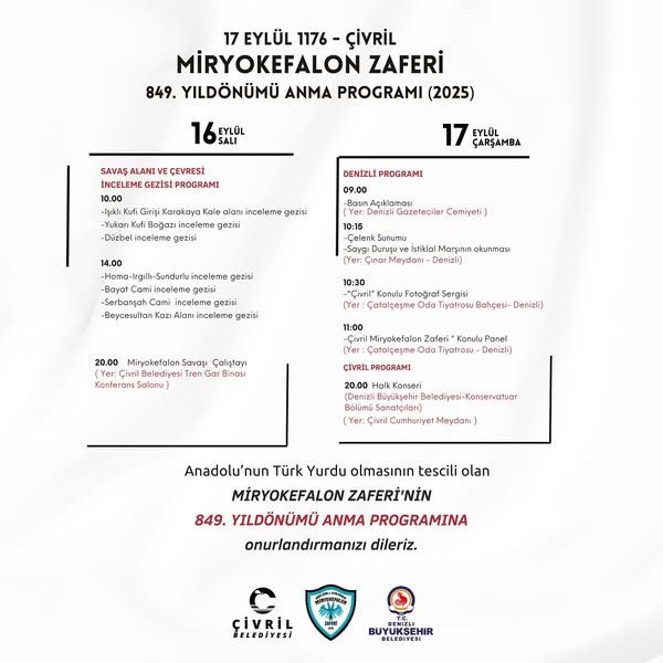 Çivril Belediyesi ve Denizli Büyükşehir Belediyesi iş birliğiyle, Anadolu’nun Türk yurdu olmasının tescili niteliğinde olan Miryokefalon Zaferi’nin 849. yıldönümü, 16–17 Eylül 2025 tarihlerinde gerçekleştirilecek programlarla anılacak.