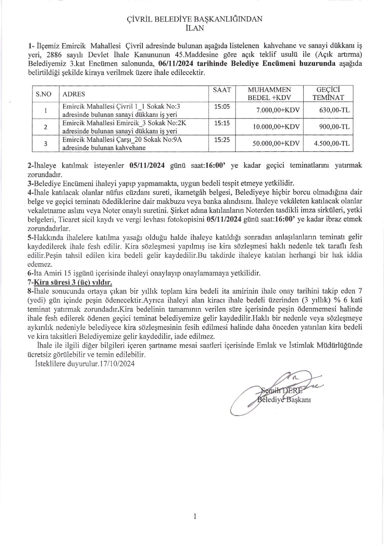 EMİRCİK MAH. 2 ADET SANAYİ DÜKKANI İŞ YERİ VE NO:9 A KAHVEHANE KİRA İHALELERİ