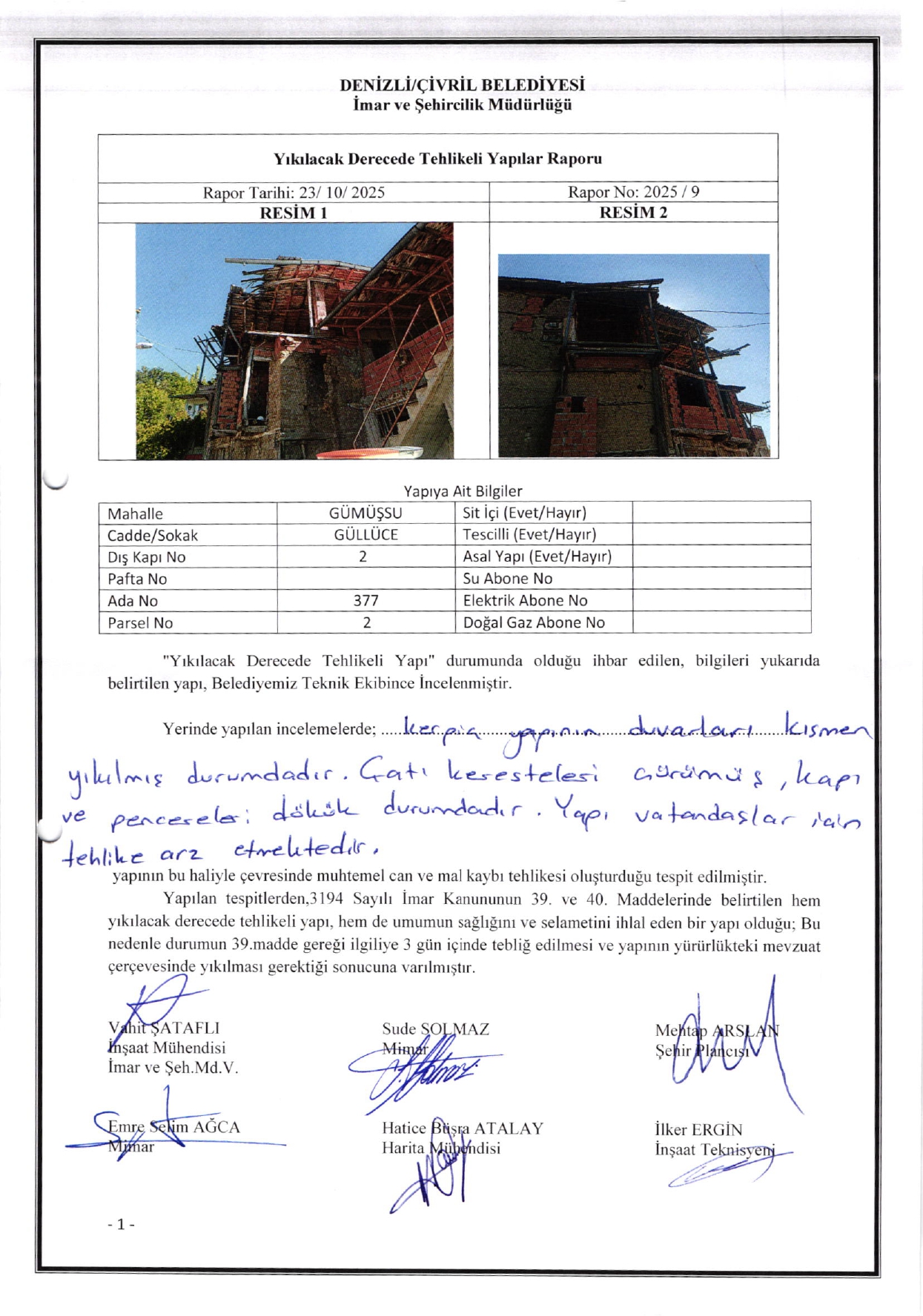GÜMÜŞSU MAH. YIKILICAK DERECEDE TEHLİKELİ YAPILAR RAPORU