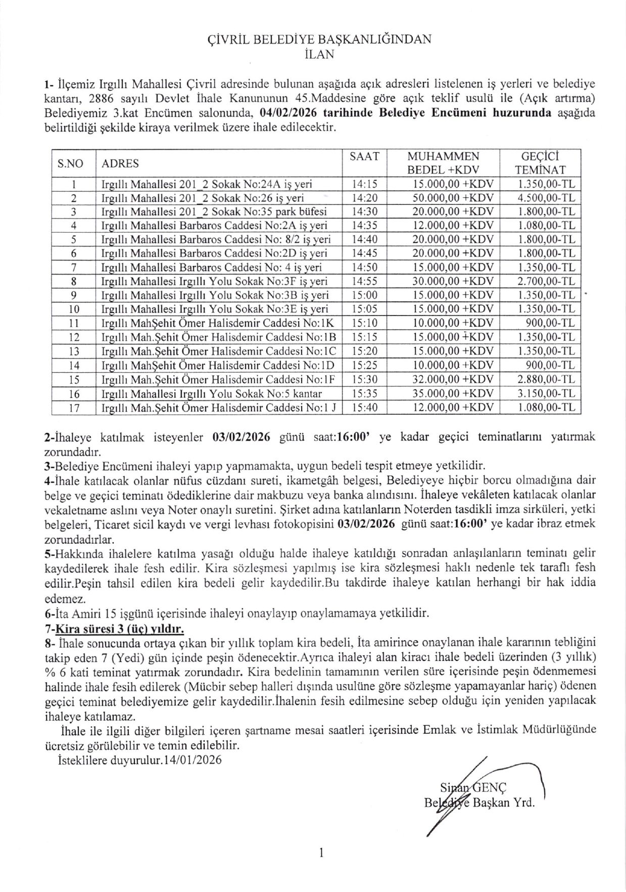 IRGILLI MAHALLESİ'NDE BULUNAN 17 ADET TAŞINMAZ KİRA İHALELERİ