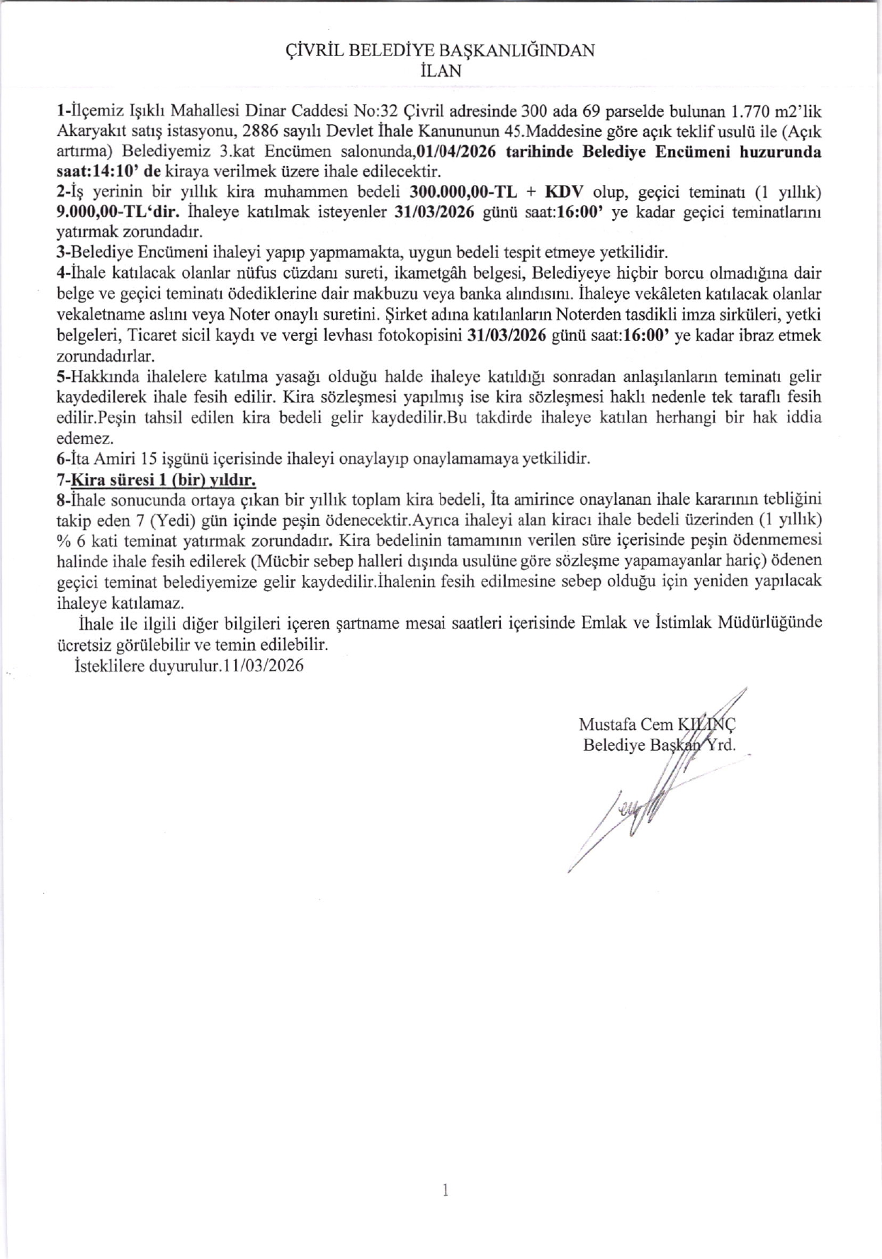 IŞIKLI MAH. DİNAR CAD. NO:32 ADRESİNDE BULUNAN AKARYAKIT SATIŞ İSTASYONU 1 YILLIK KİRA İHALESİ