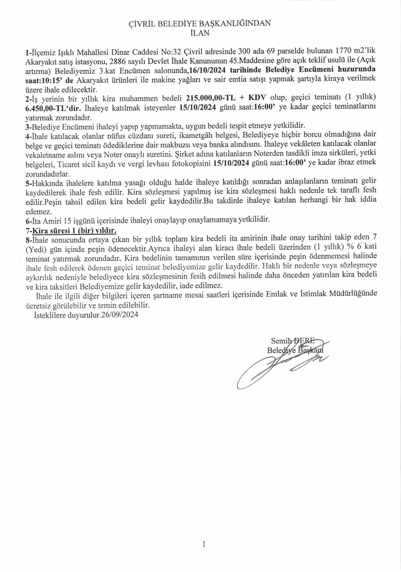 IŞIKLI MAH. DİNAR CAD. NO:32 ÇİVRİL ADRESİNDE BULUNAN AKARYAKIT İSTASYONU 1 YILLIK KİRA İHALESİ