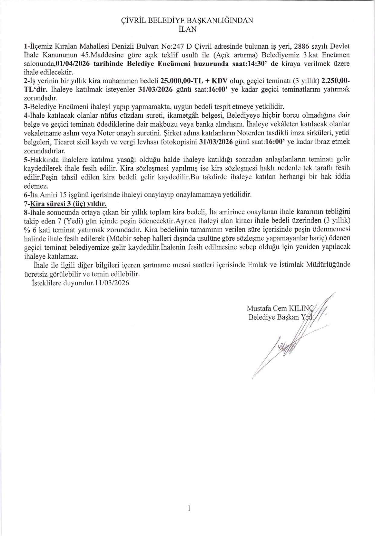 KIRALAN MAH. DENİZLİ BULVARI NO:247D ADRESİNDE BULUNAN İŞ YERİ KİRA İHALESİ