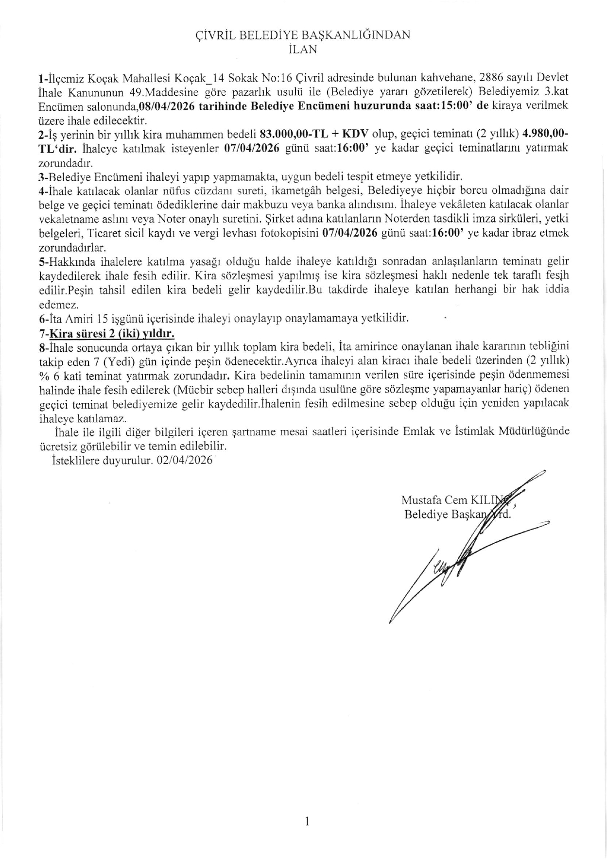KOÇAK MAH. KOÇAK_14 SOK. NO:16 ADRESİNDE BULUNAN KAHVEHANE 49.MADDE KİRA İHALESİ