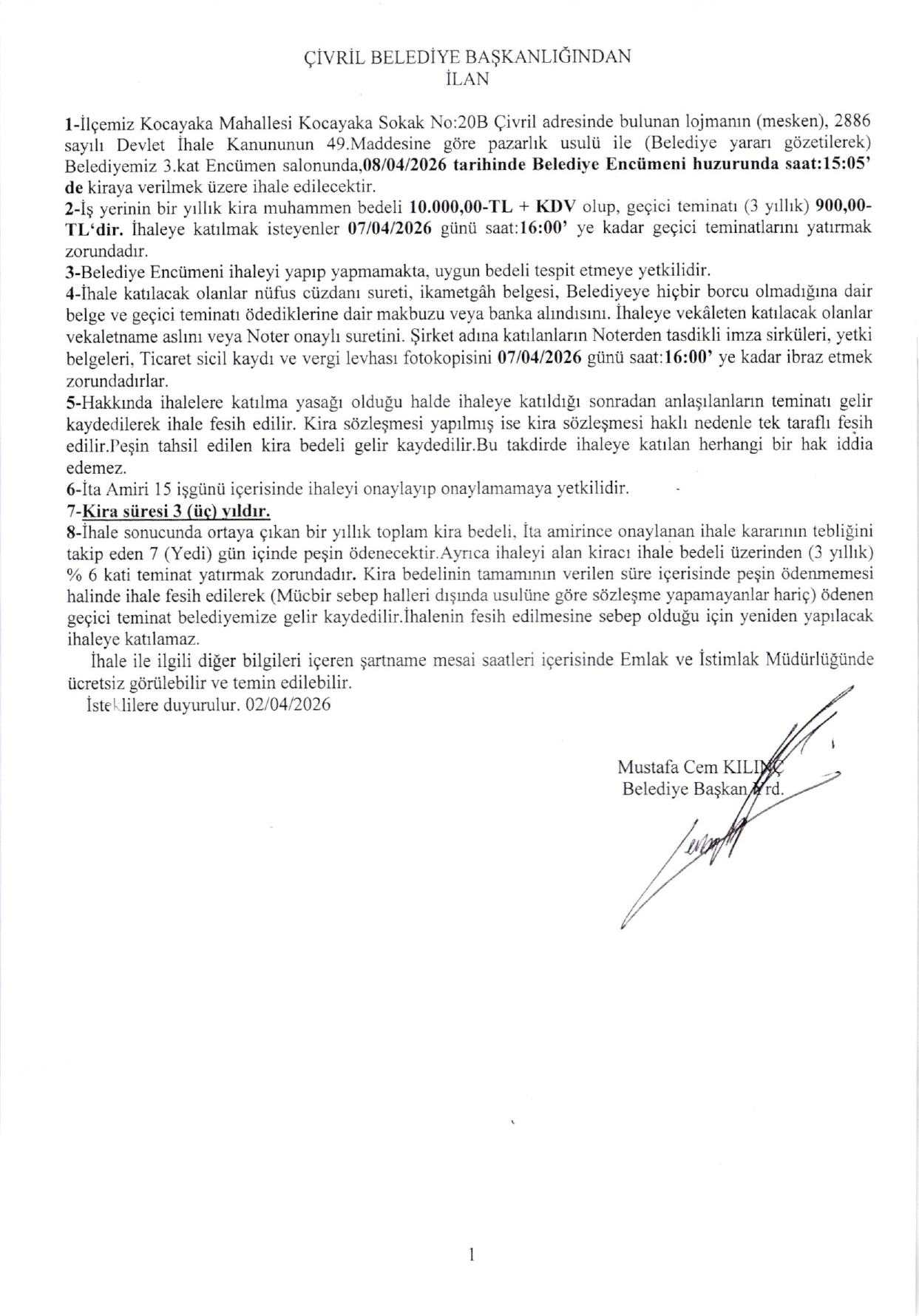 KOCAYAKA MAH. KOCAYAK SOK. NO:20B ADRESİNDE BULUNAN LOJMAN (MESKEN ) 49.MADDE KİRA İHALESİ