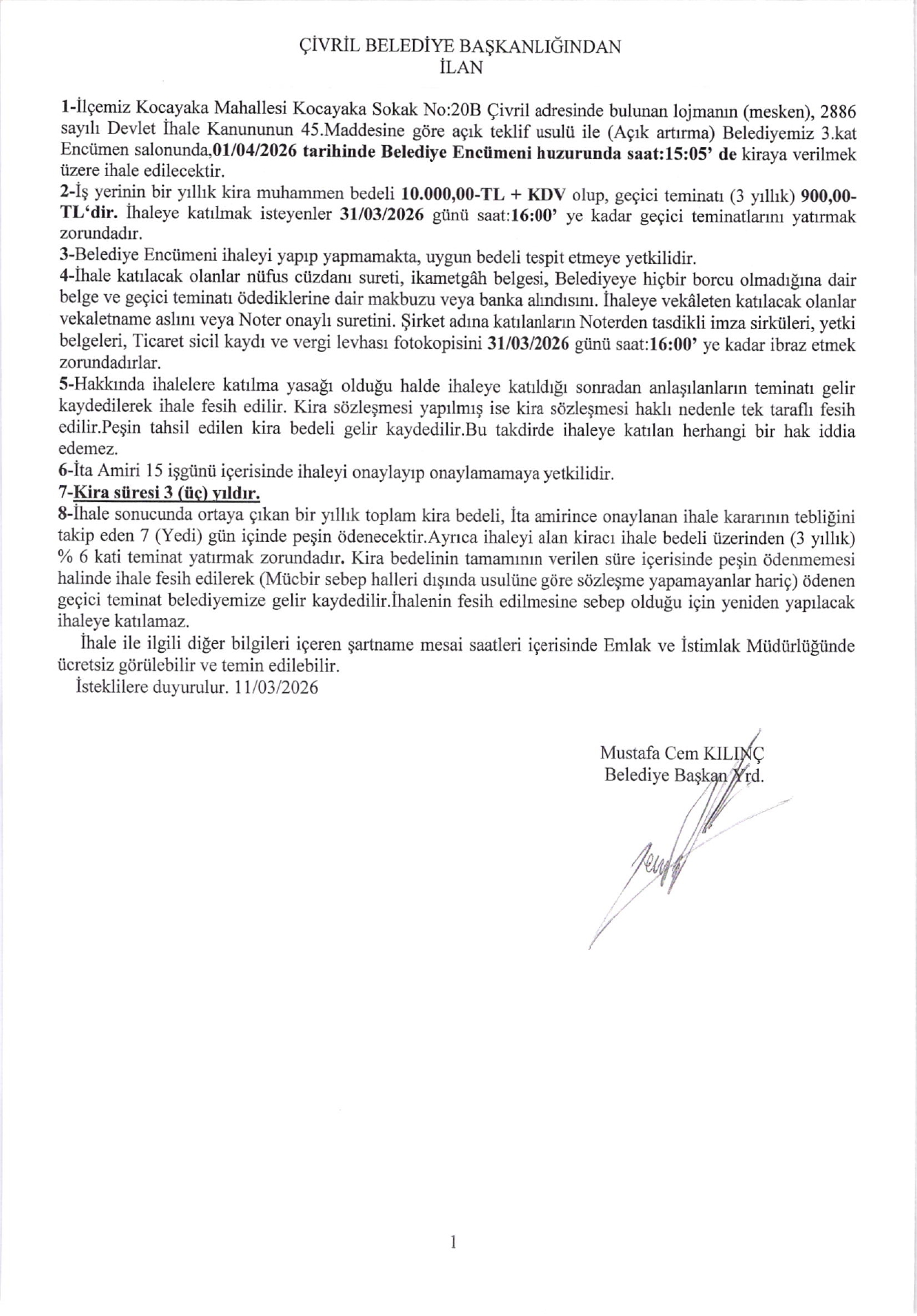KOCAYAKA MAH. KOCAYAK SOK. NO:20B ADRESİNDE BULUNAN LOJMAN (MESKEN ) KİRA İHALESİ