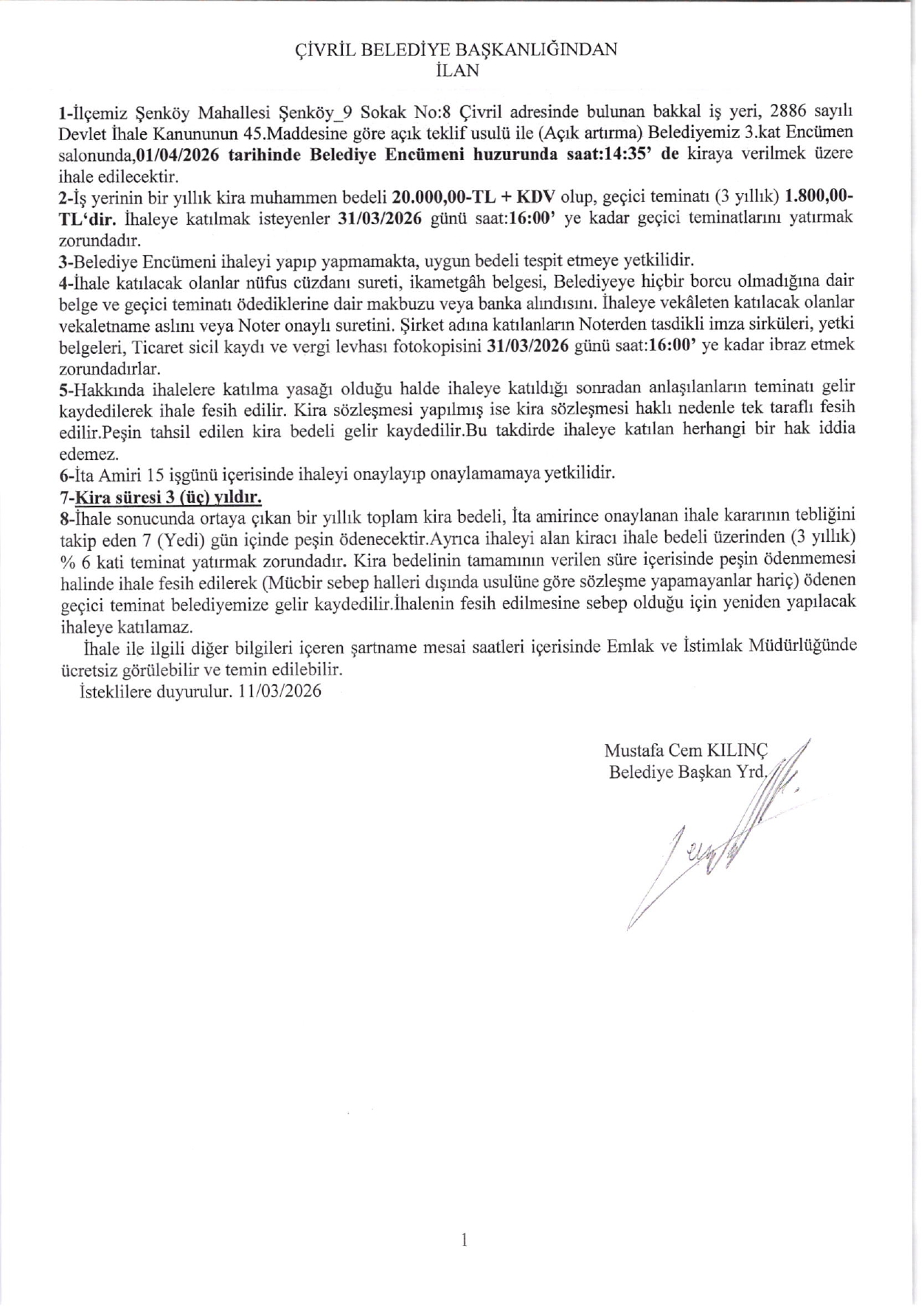 ŞENKÖY MAH. ŞENKÖY_9 SOK. NO8 ADRESİNDE BULUNAN BAKKAL İŞ YERİ KİRA İHALESİ
