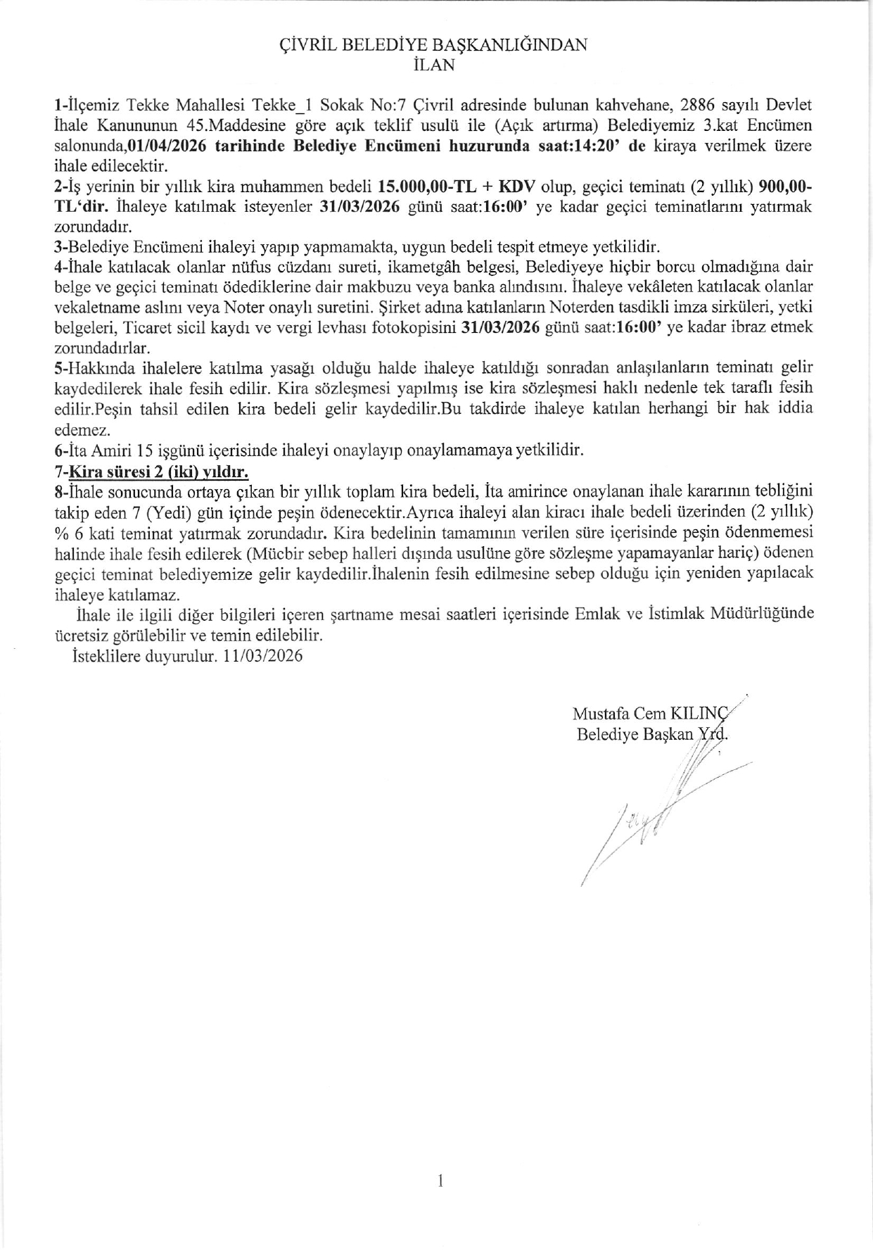 TEKKE MAH TEKKE_1 SOK. NO:7 KAHVEHANE KİRA İHALESİ
