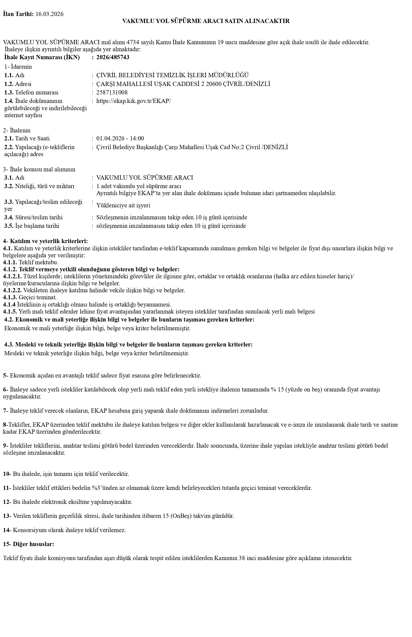VAKUMLU YOL SÜPÜRME ARACI SATIN ALMA İŞİ İLANI