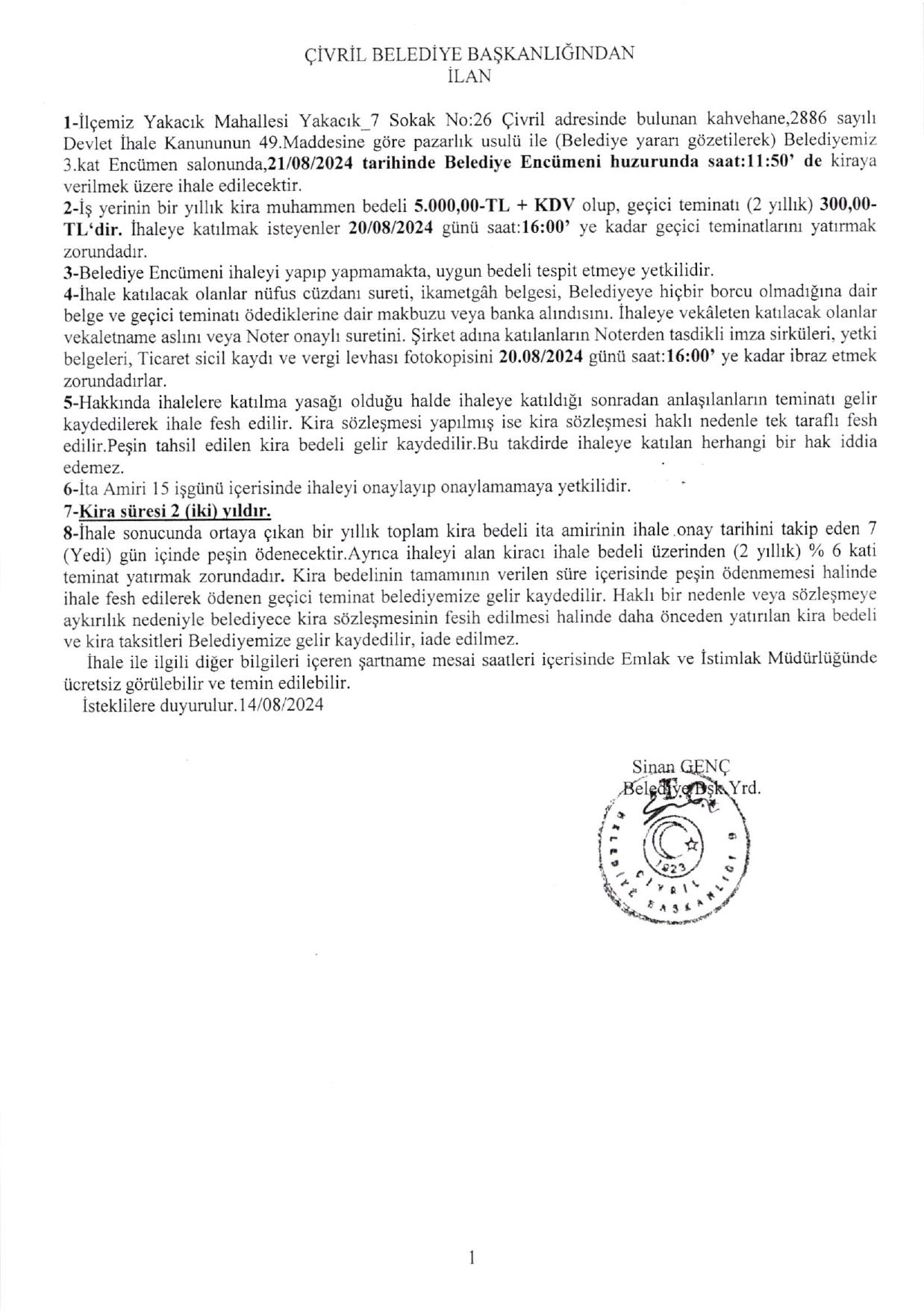 YAKACIK MAHALLESİ YAKACIK _7 SOKAK NO:26 KAHVEHANE 49.MADDE KİRA İHALESİ